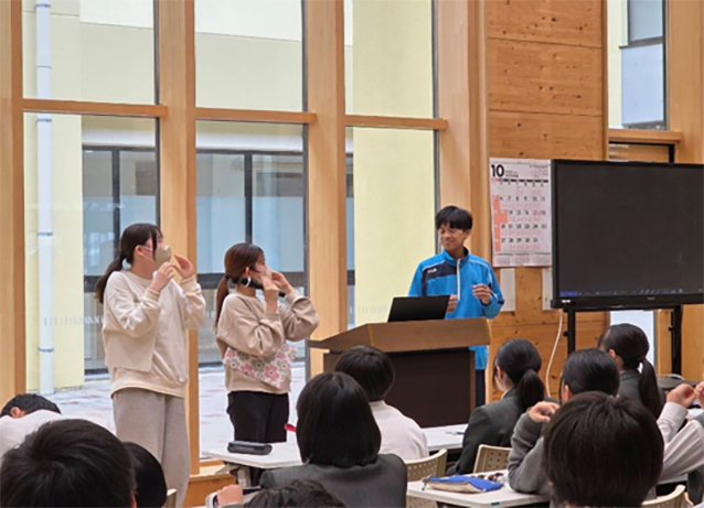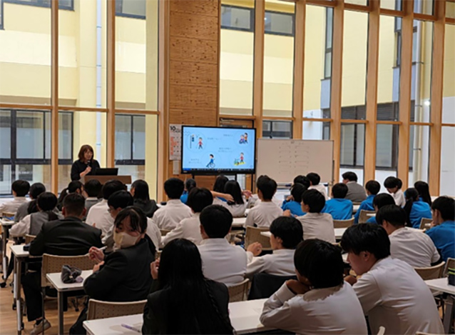 「ふくしについて」 「みつみ福祉会の事業紹介」 「はたらくってなんだろう」についてお話しし、また、こども園保育士による手遊びや自分が保育を選んだきっかけなどを生徒さんに聞いていただきました。このようなかかわりの中で、「ふくし」に興味や関心を寄せていただけたらありがたいと思い、また、ふくしの現場を目指す若者が出ることを期待しつつ山南中学校を後にしました。