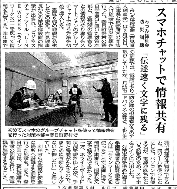 2月27日 法人17施設合同防災訓練(情報通達訓練)を実施しました。今回の訓練は地震発生の想定で兵庫県・京都府の事業所管理者にて情報通達訓練を実施しました。災害発生時に対策本部を兵庫:春日学園、京都:三愛荘に設置し、スマートフォンのグループチャットで各施設の状況について情報交換を行いました。訓練の様子が新聞に掲載されましたのでご覧ください。